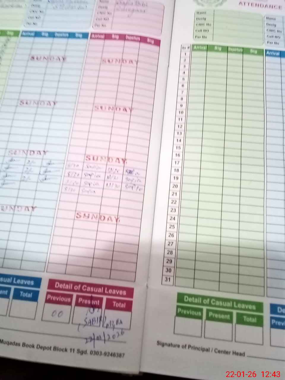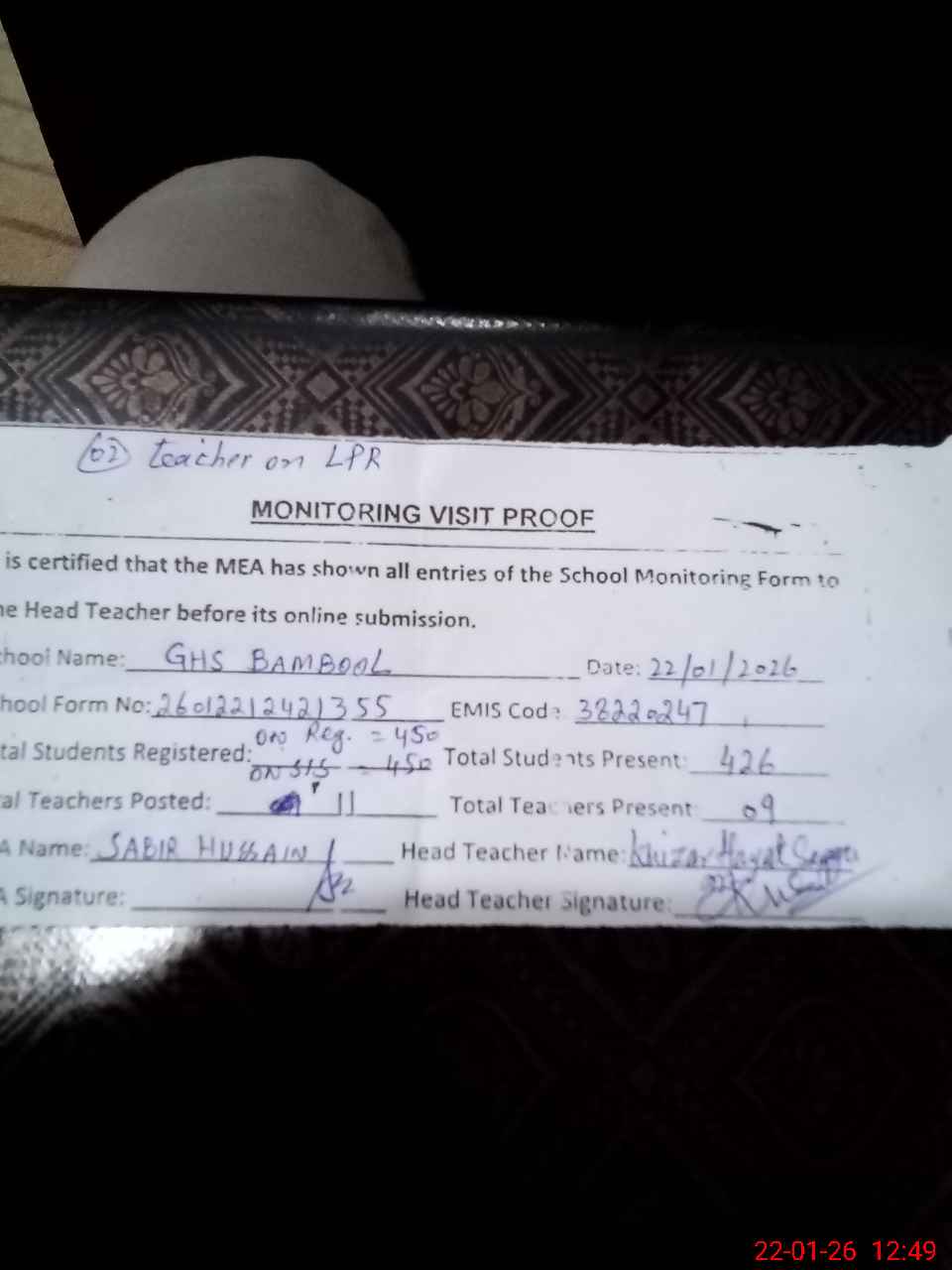 | Remarks (Use Separate Page if Required): no teacher absent total students on register 450 total students on SiS 450 last admin visit by DEO SE on 29 Dec 2025 | |||||