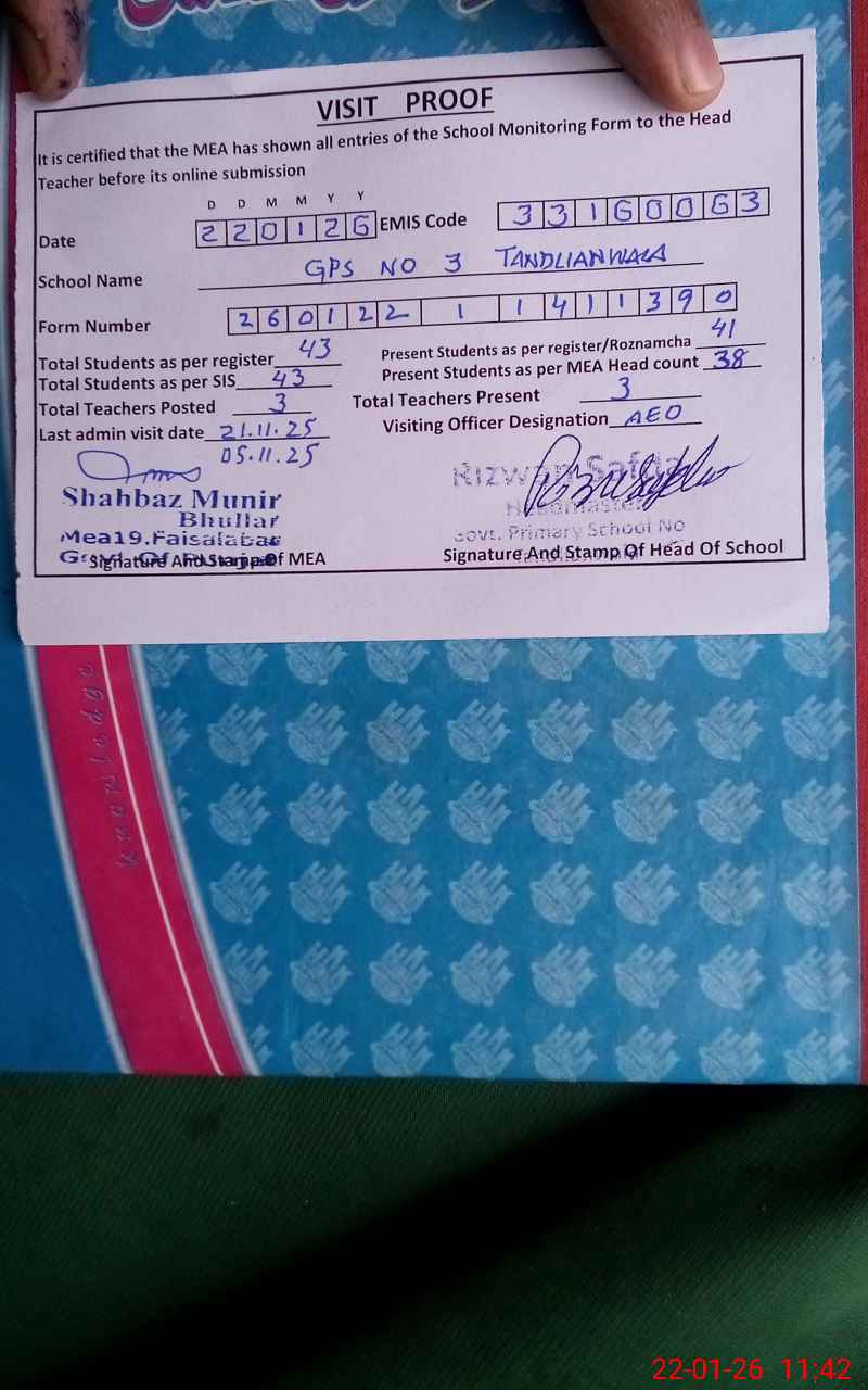 | EMIS Code: 33160063 | Name of School: GPS NO 3 TANDLIANWALA | |||