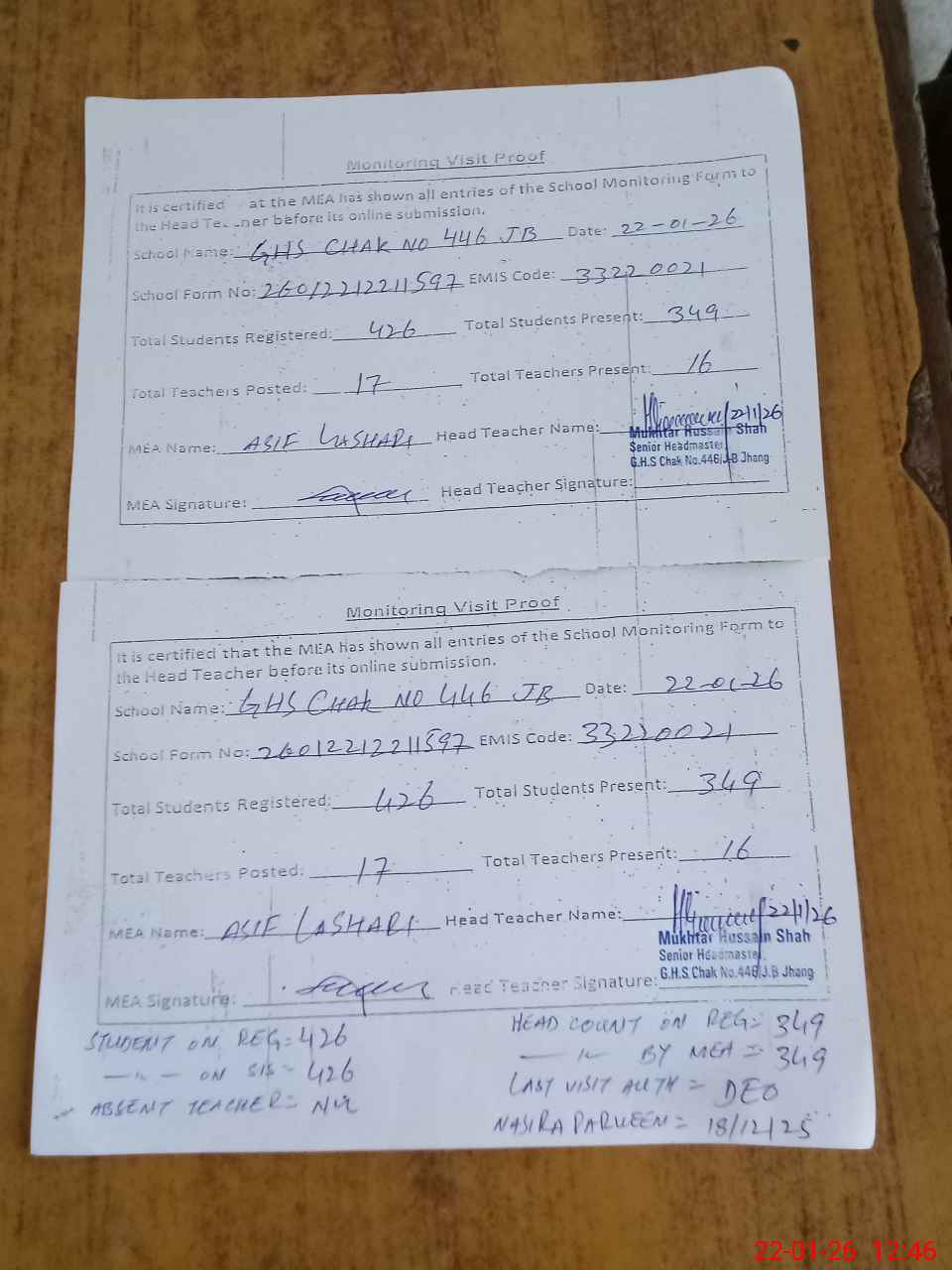 | EMIS Code: 33220021 | Name of School: GHS CHAK NO 446 JB | |||