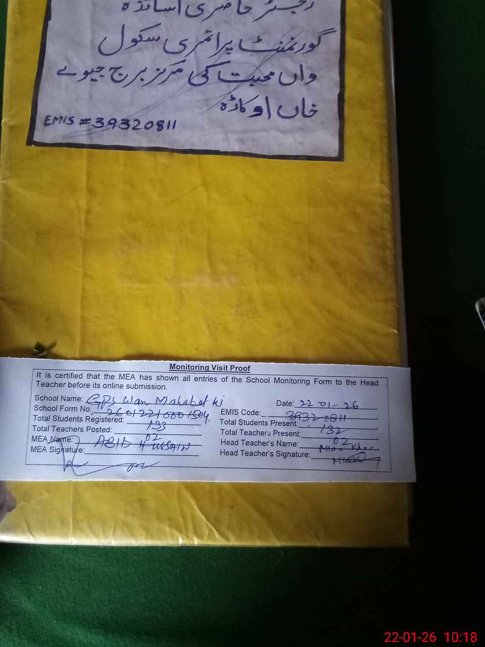 | Attendance Register | Head Teacher | MEA with School | Visit Proof |