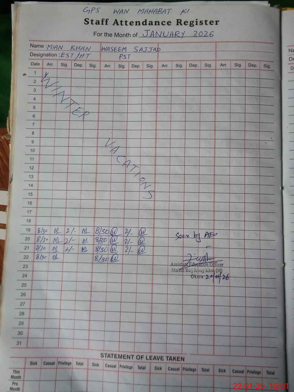 | CNIC | Full Name | Designation | R/C | Absence During Last Calender Month |
