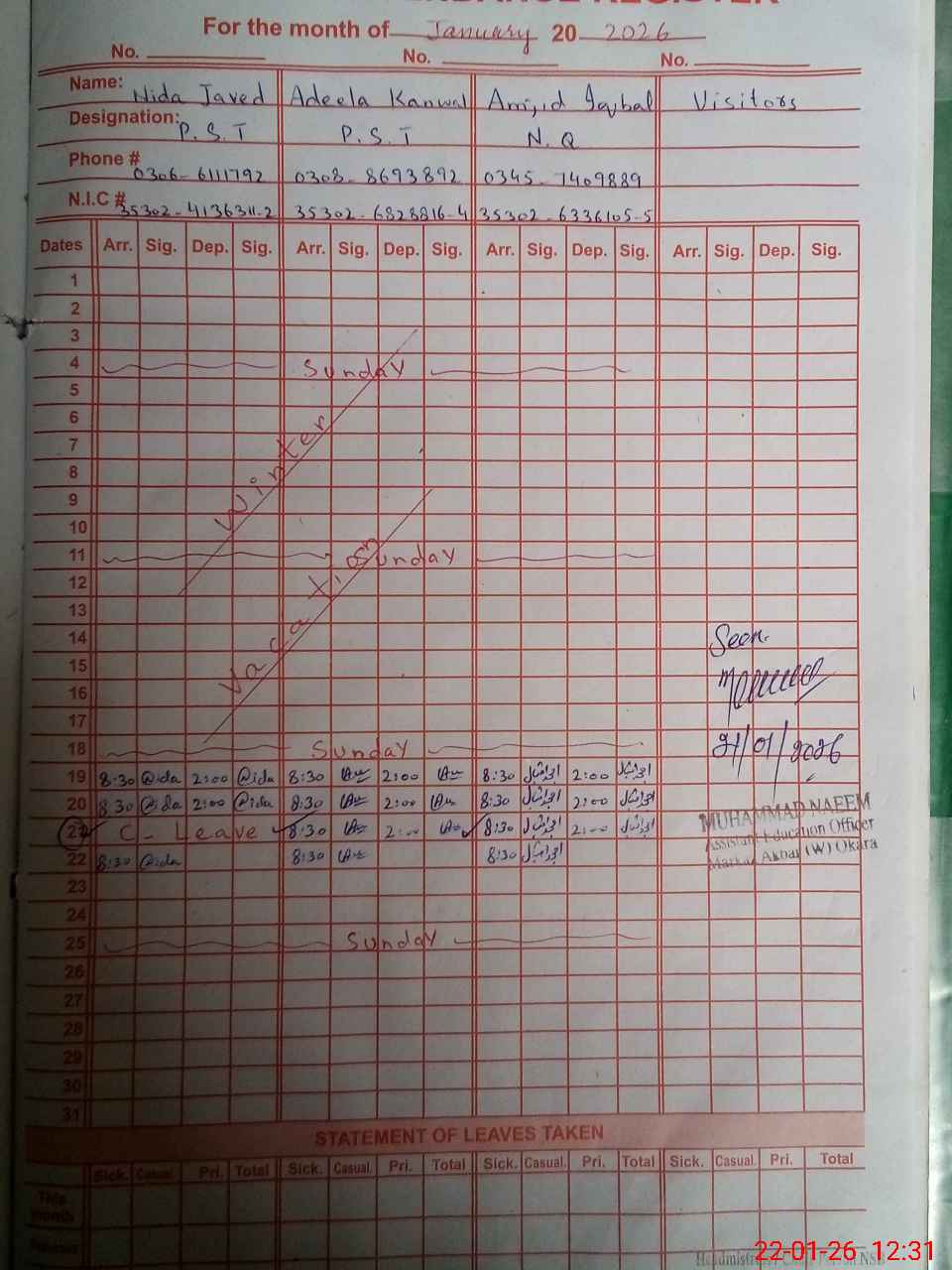 | CNIC | Full Name | Designation | R/C | Absence During Last Calender Month |