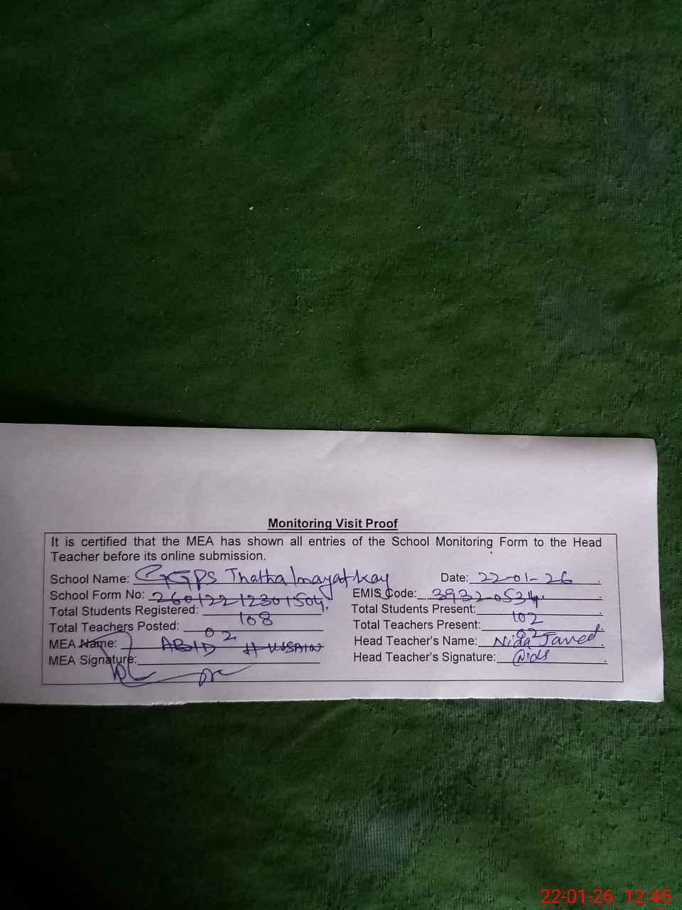 | Attendance Register | Head Teacher | MEA with School | Visit Proof |