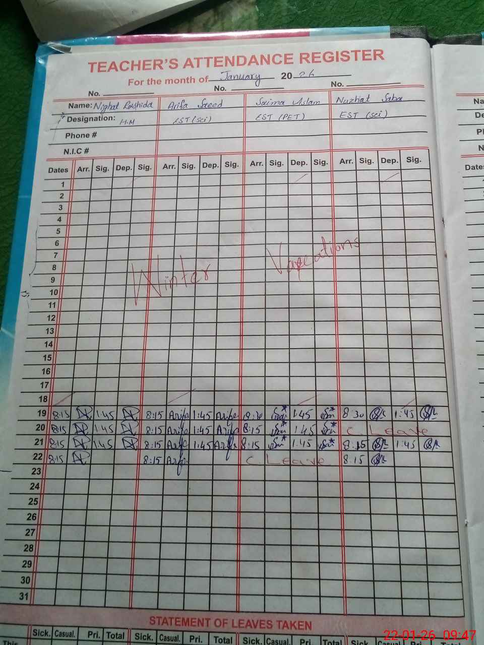 | Remarks (Use Separate Page if Required): Teacher samreen Yaqoob 31304 84619822 section leave not available in school at time of visit mea Mark Absent | |||||