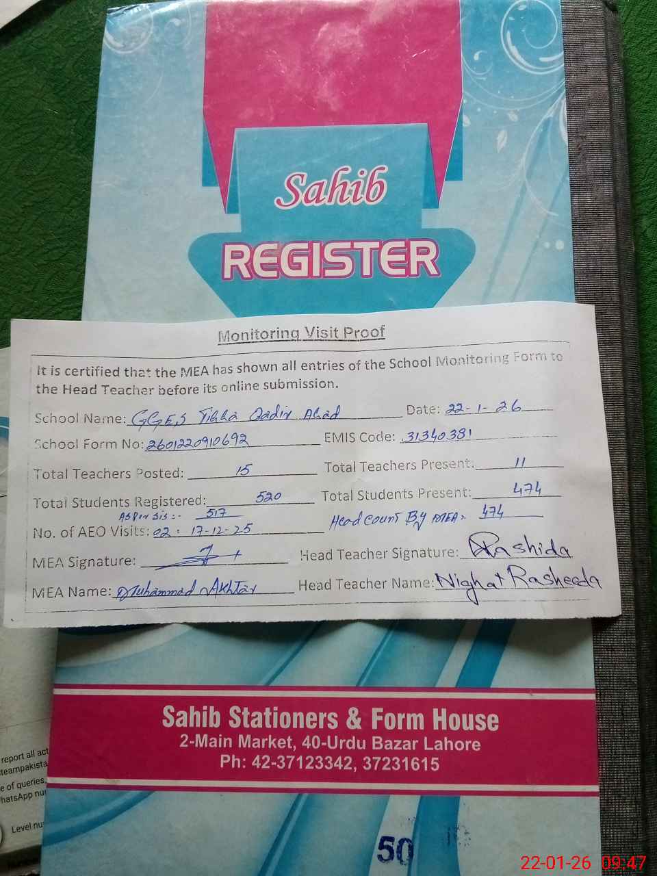 | Attendance Register | Head Teacher | MEA with School | Visit Proof |