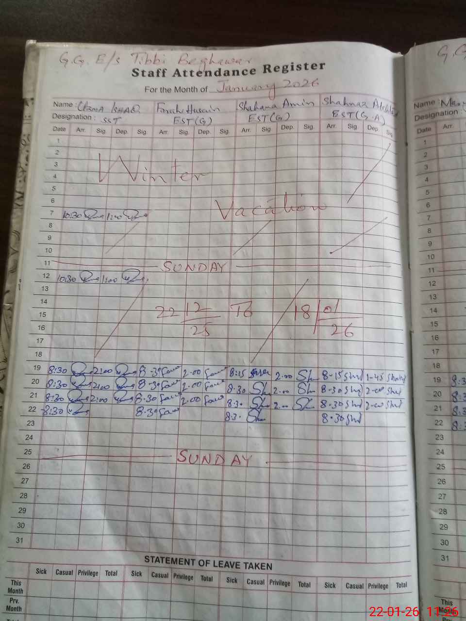| Leave | Duty | Absent | Maternity | Medical | Ex- Pak |