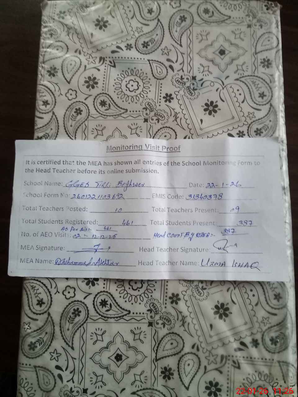 | Attendance Register | Head Teacher | MEA with School | Visit Proof |