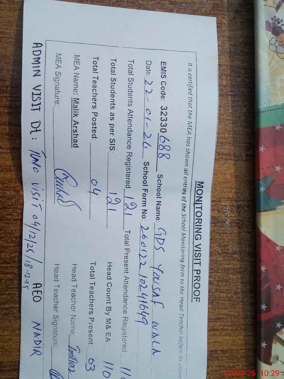 | EMIS Code: 32330688 | Name of School: GPS YOUSAF WALA | |||
