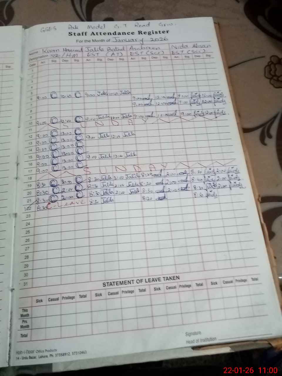| CNIC | Full Name | Designation | R/C | Absence During Last Calender Month |