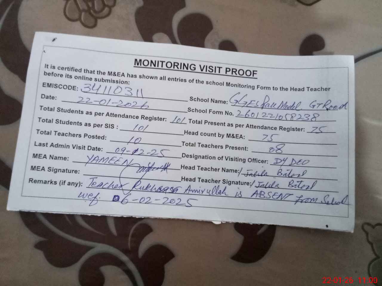 | Attendance Register | Head Teacher | MEA with School | Visit Proof |