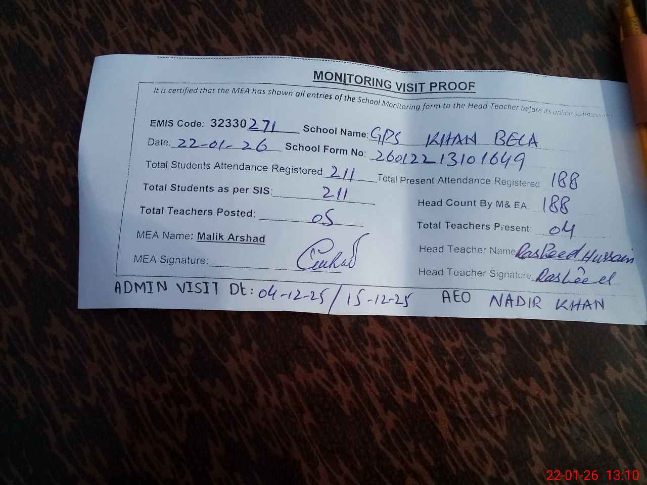 | Attendance Register | Head Teacher | MEA with School | Visit Proof |