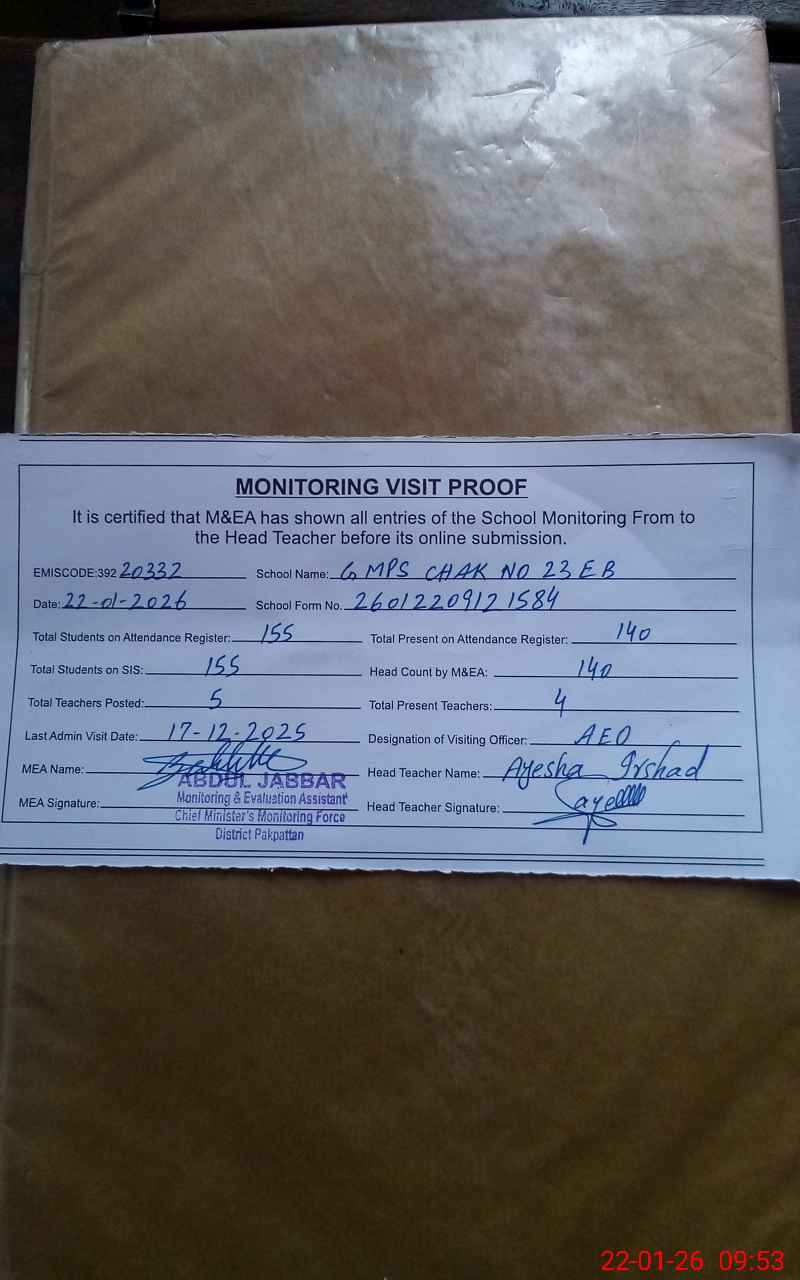 | EMIS Code: 39220332 | Name of School: GMPS CHAK NO. 23 EB | |||