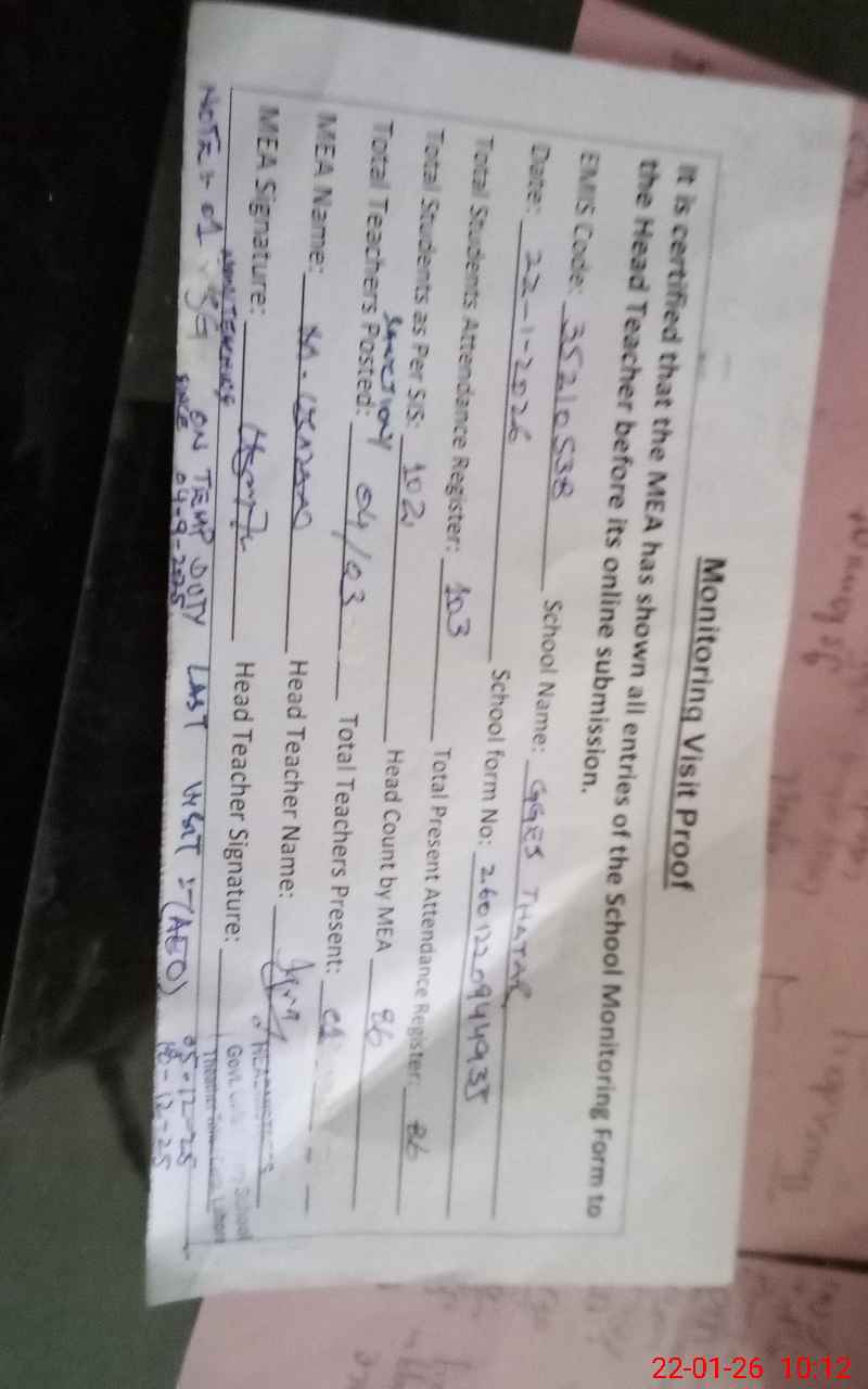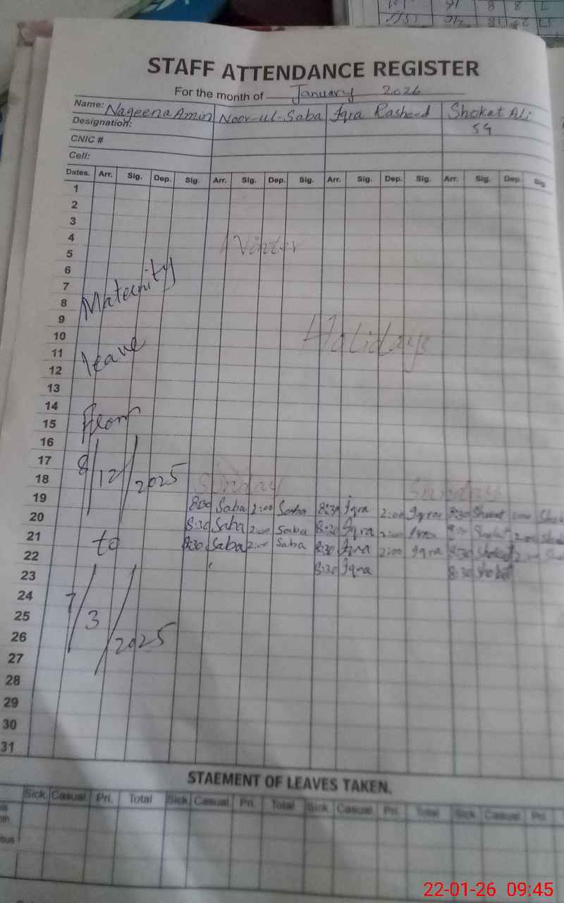 | Remarks (Use Separate Page if Required): school has upgraded primary to elementary since September, 2025 but there is no student in elementary classes. 01 teacher named Noor ul Saba marked absent due to came at 0920am 01 nonteaching named Naila Ramzan SG is on temporary duty from 04 September 2025. 02 wash rooms are nonfunctional due to blocked and tap broken Switch board is broken and dangerous for students | |||||