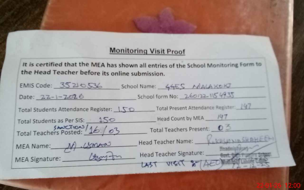| Attendance Register | Head Teacher | MEA with School | Visit Proof |