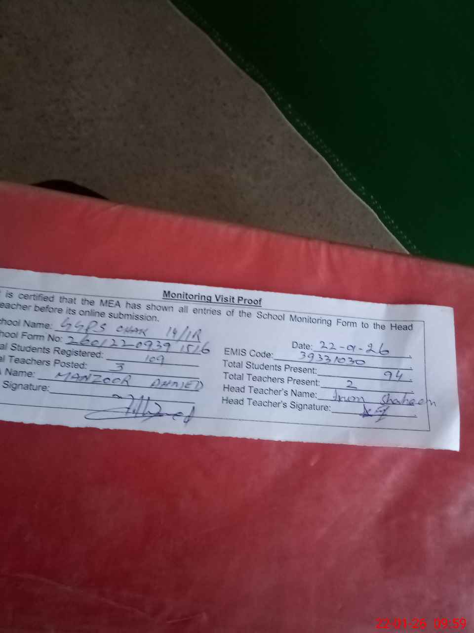 | Attendance Register | Head Teacher | MEA with School | Visit Proof |