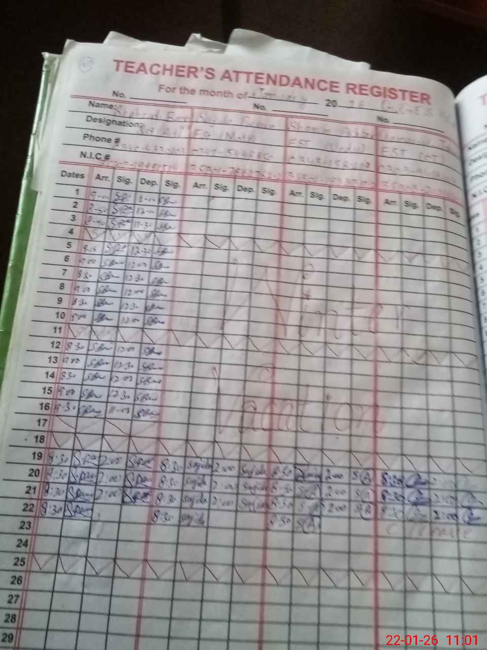 | CNIC | Full Name | Designation | R/C | Absence During Last Calender Month |