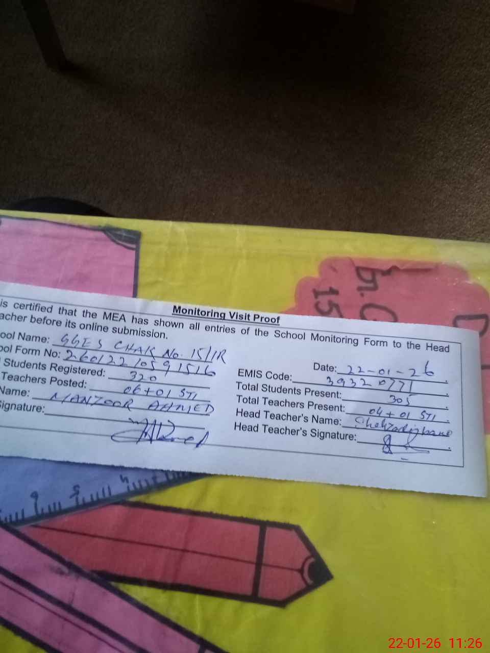 | Attendance Register | Head Teacher | MEA with School | Visit Proof |