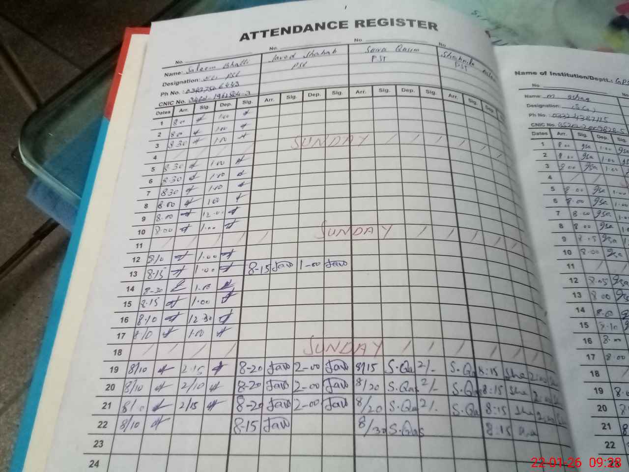 | CNIC | Full Name | Designation | R/C | Absence during last cal. month |