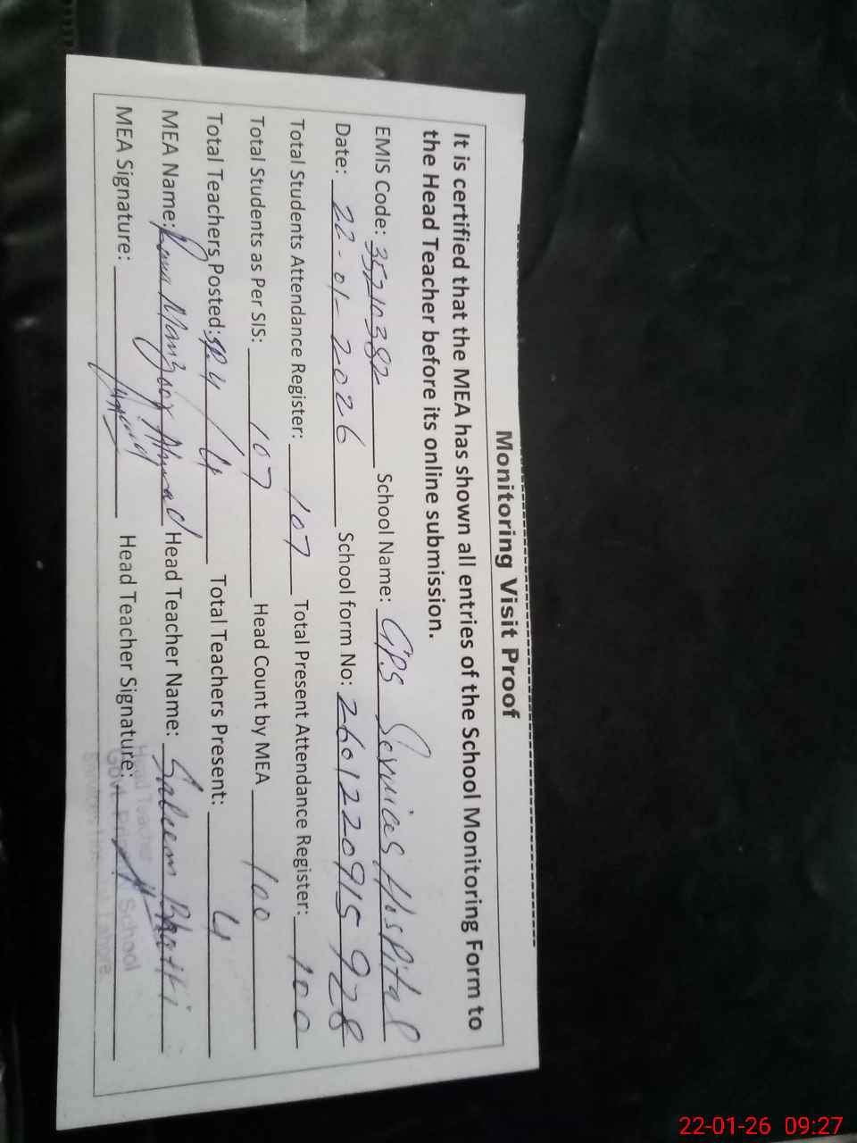 | Attendance Register | Head Teacher | MEA with School | Visit Proof |
