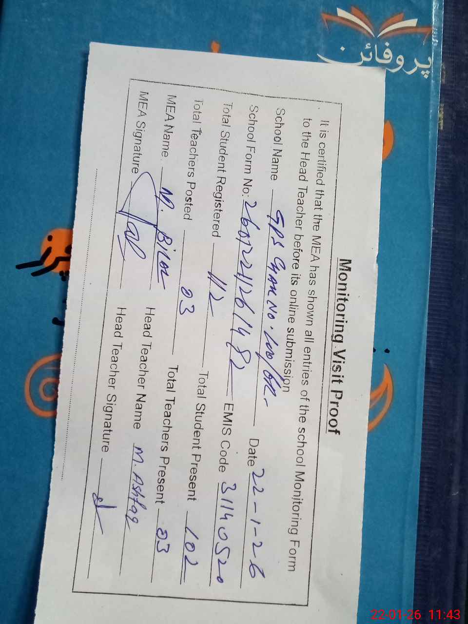 | Attendance Register | Head Teacher | MEA with School | Visit Proof |