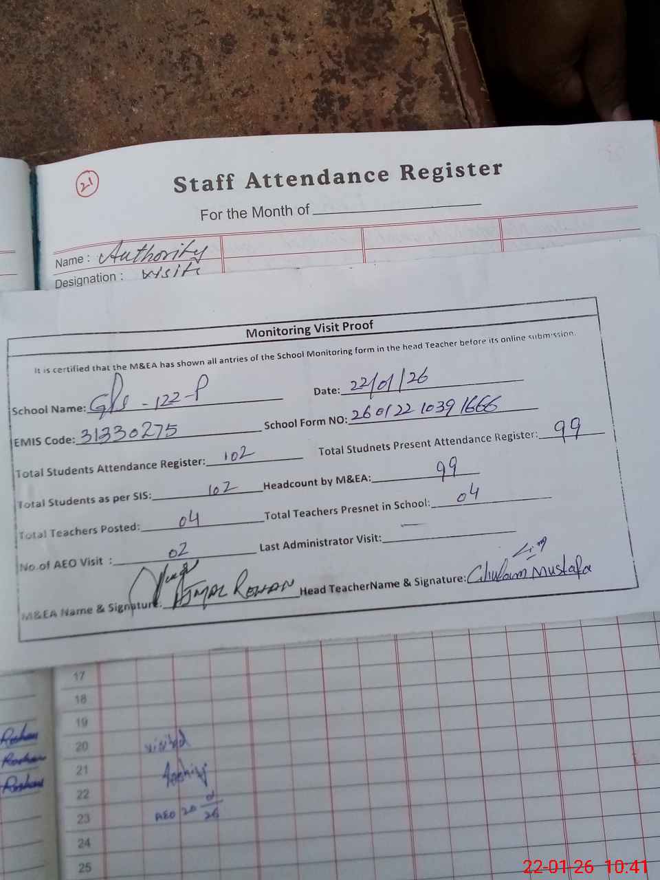 | EMIS Code: 31330275 | Name of School: GPS CHAK NO. 122/P | |||