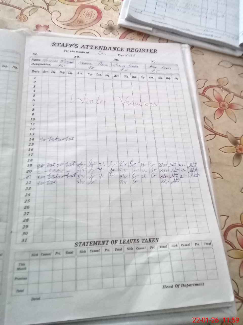 | Leave | Duty | Absent | Maternity | Medical | Ex- Pak |