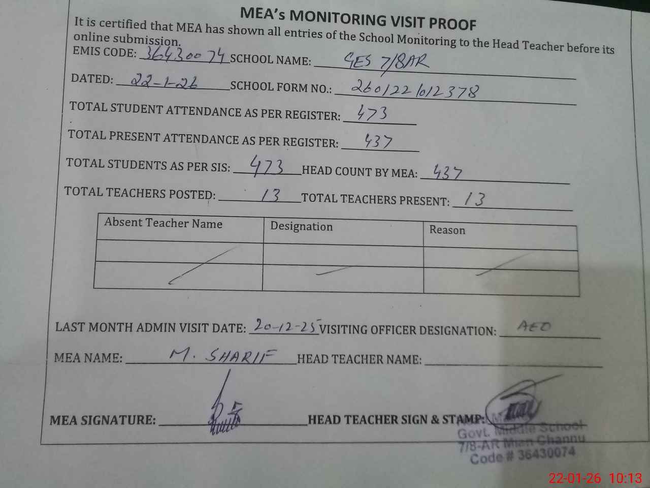 | Attendance Register | Head Teacher | MEA with School | Visit Proof |