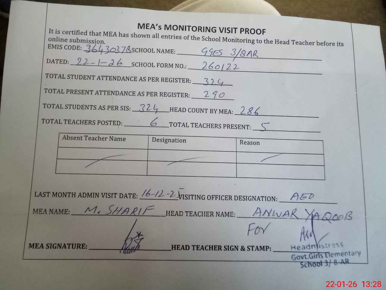 | Attendance Register | Head Teacher | MEA with School | Visit Proof |
