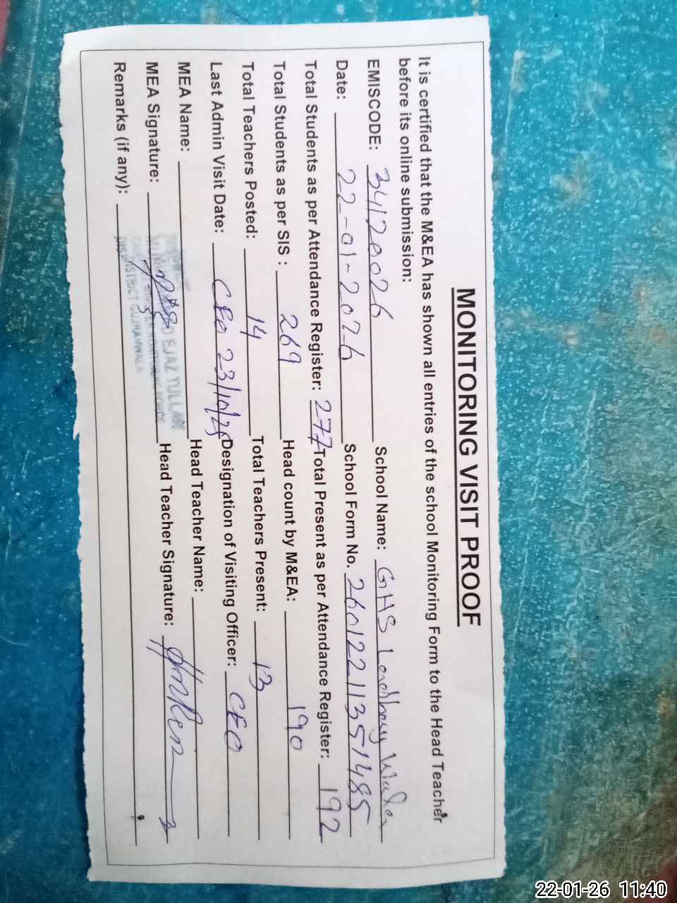 | Attendance Register | Head Teacher | MEA with School | Visit Proof |
