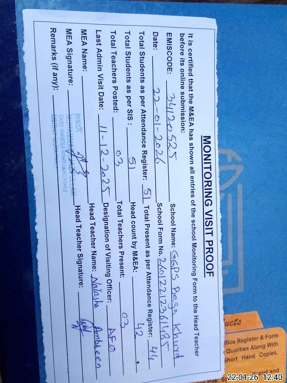 | EMIS Code: 34120525 | Name of School: GGPS BEGA KHURD | |||