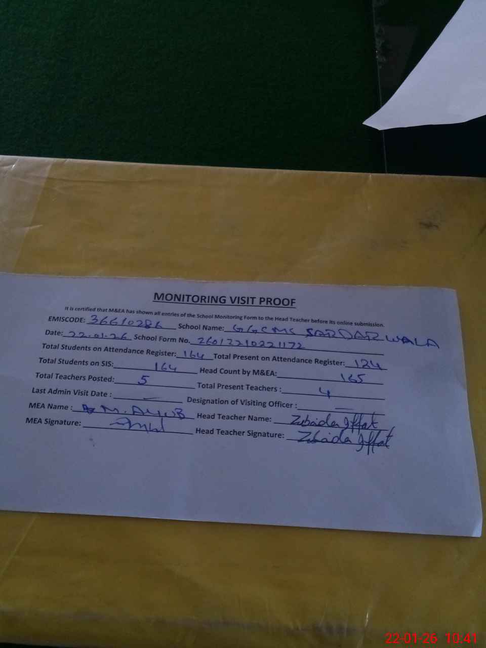 | Attendance Register | Head Teacher | MEA with School | Visit Proof |