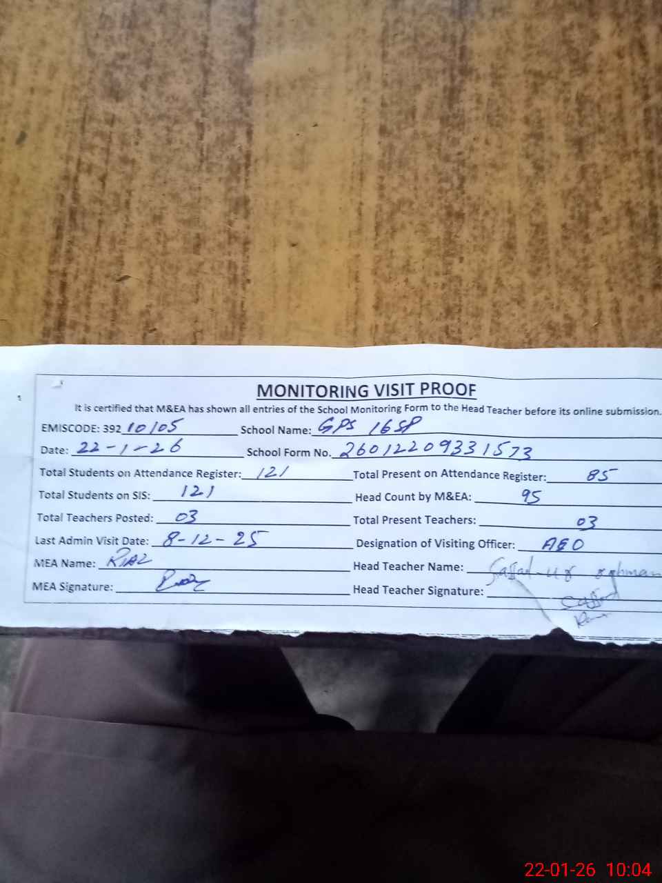 | Attendance Register | Head Teacher | MEA with School | Visit Proof |