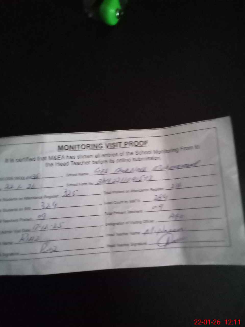 | Attendance Register | Head Teacher | MEA with School | Visit Proof |