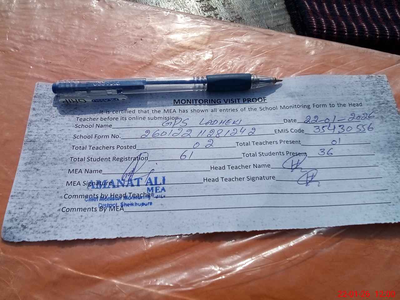 | Attendance Register | Head Teacher | MEA with School | Visit Proof |