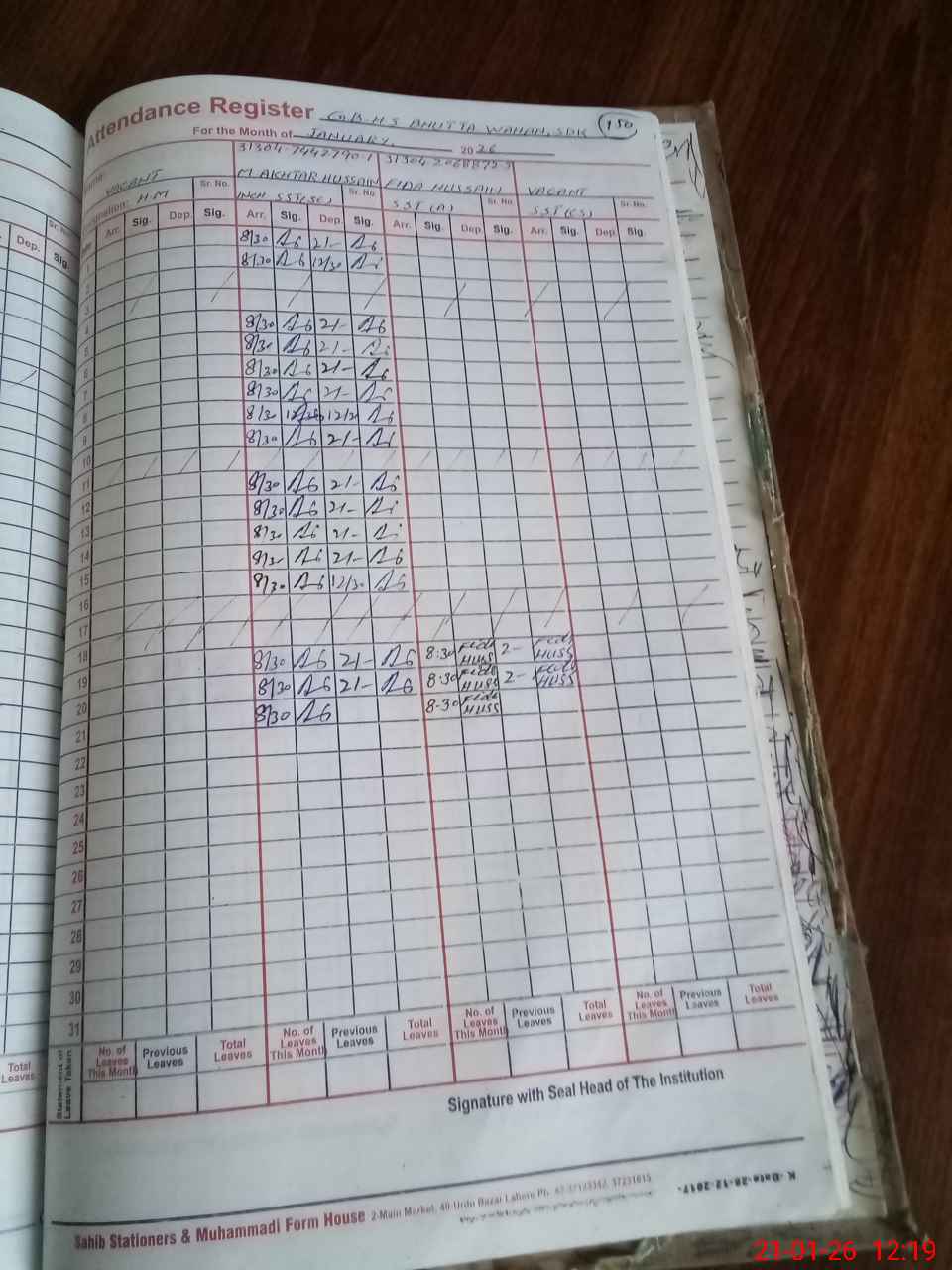 | CNIC | Full Name | Designation | R/C | Absence During Last Calender Month |