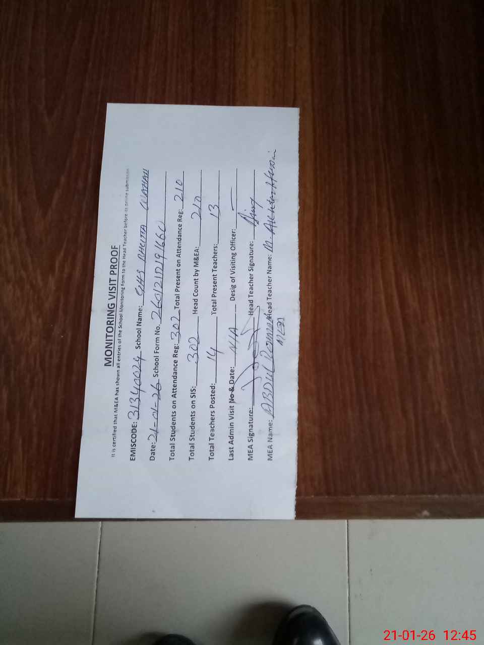 | Attendance Register | Head Teacher | MEA with School | Visit Proof |