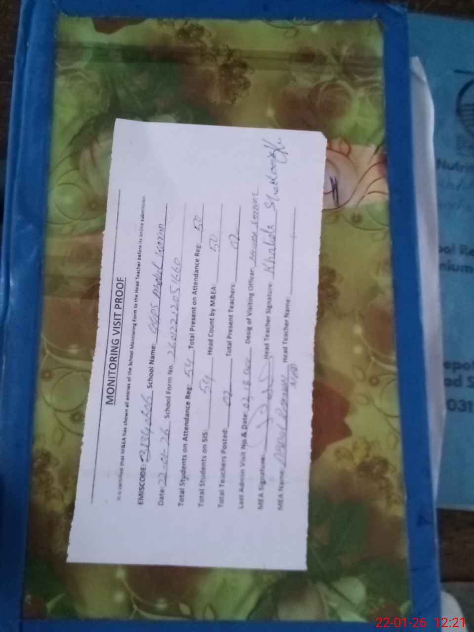 | Attendance Register | Head Teacher | MEA with School | Visit Proof |
