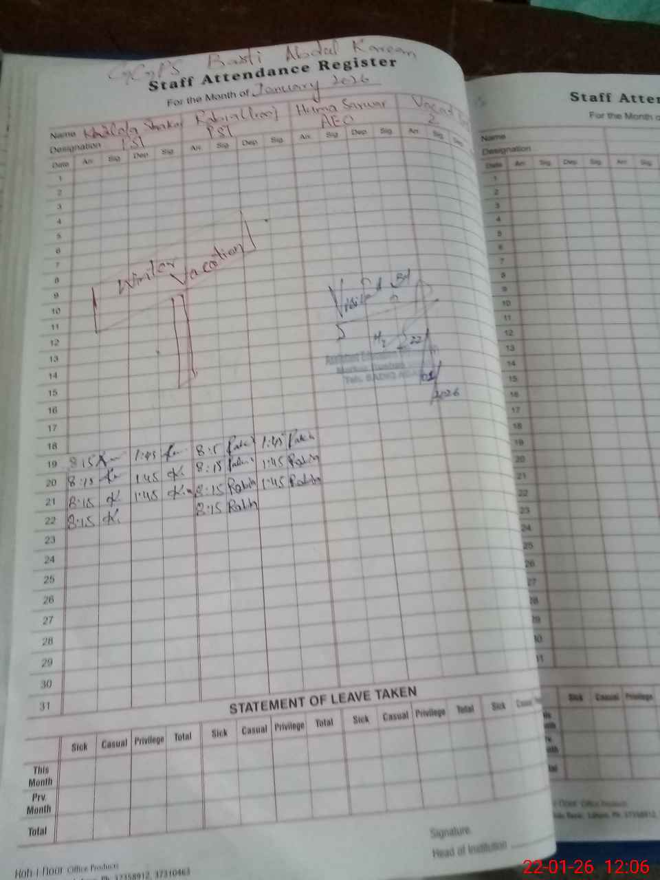 | Name: Kh**** Sh**** Designation: (School Headmaster's/Headmistress's) PST Phone/Cell Number: 03**** |