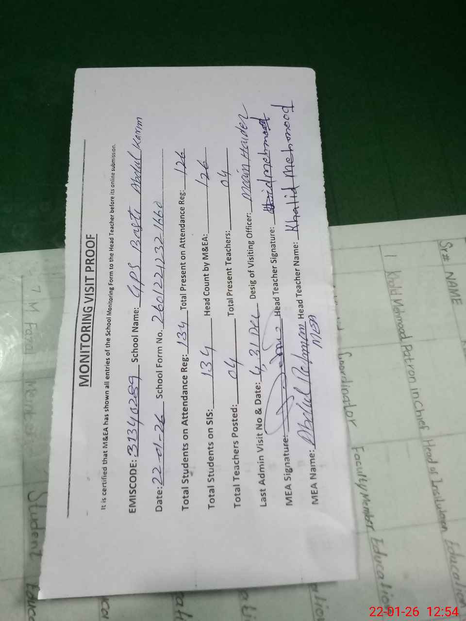 | Attendance Register | Head Teacher | MEA with School | Visit Proof |