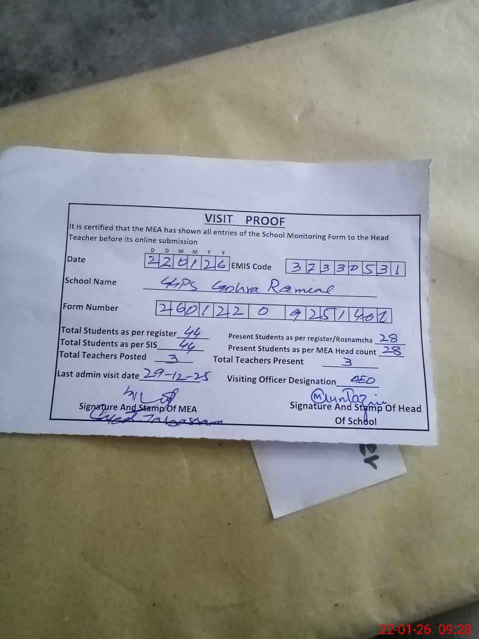 | Attendance Register | Head Teacher | MEA with School | Visit Proof |