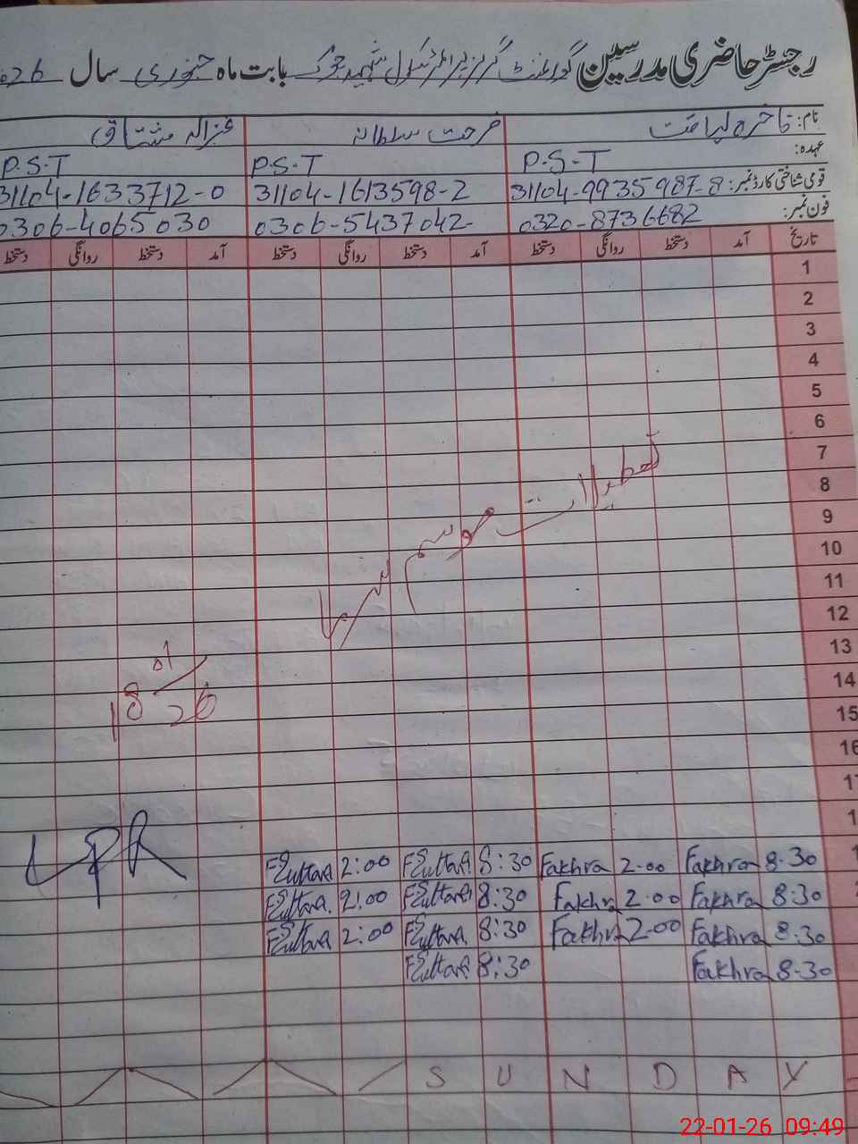 | CNIC | Full Name | Designation | R/C | Absence During Last Calender Month |