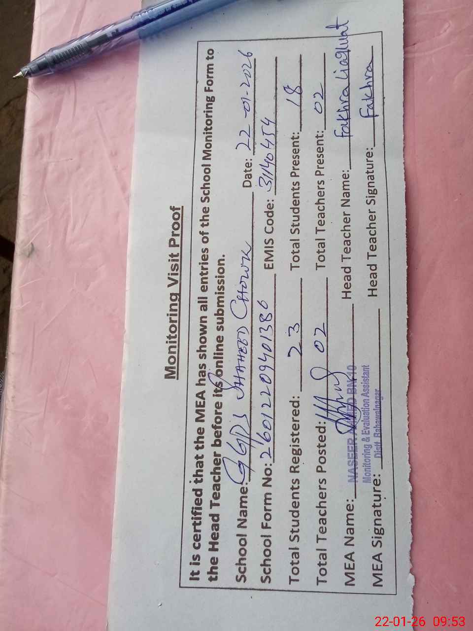| Attendance Register | Head Teacher | MEA with School | Visit Proof |