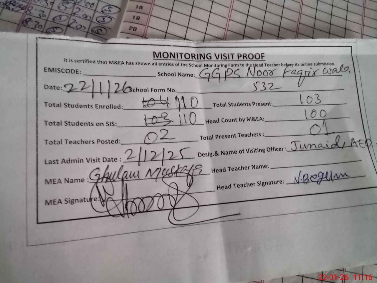 | Attendance Register | Head Teacher | MEA with School | Visit Proof |