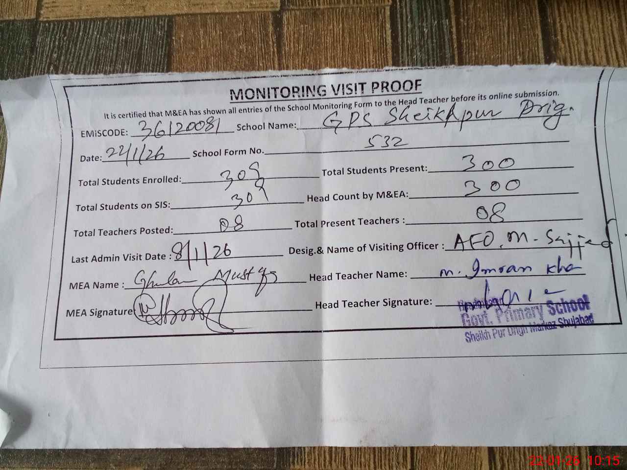 | Name: MO**** IM**** Designation: (School Headmaster's/Headmistress's) PST/PTC/JV Phone/Cell Number: 03**** |