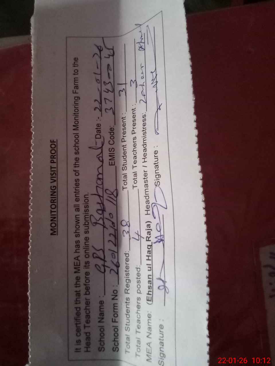 | Attendance Register | Head Teacher | MEA with School | Visit Proof |