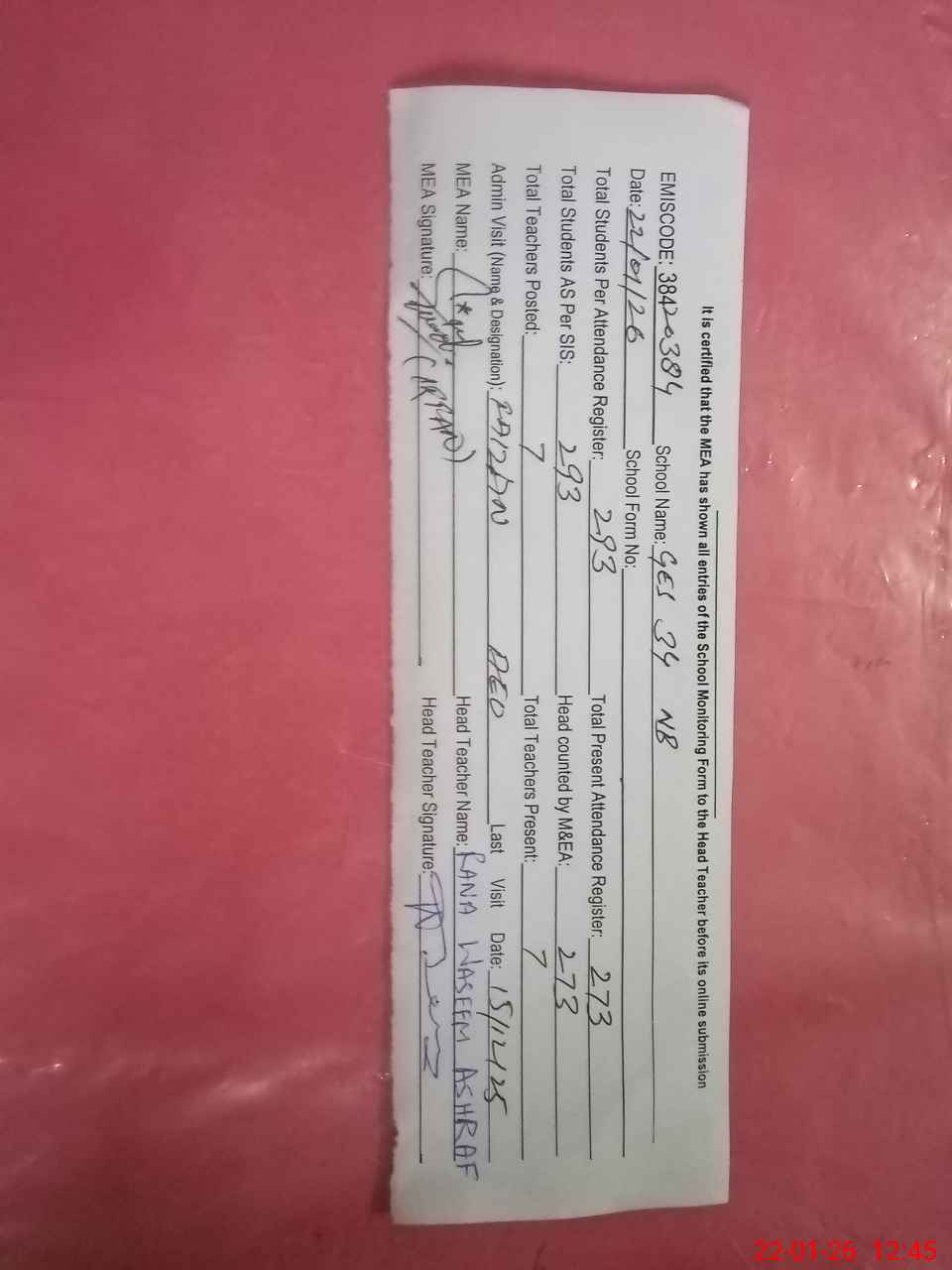 | Attendance Register | Head Teacher | MEA with School | Visit Proof |