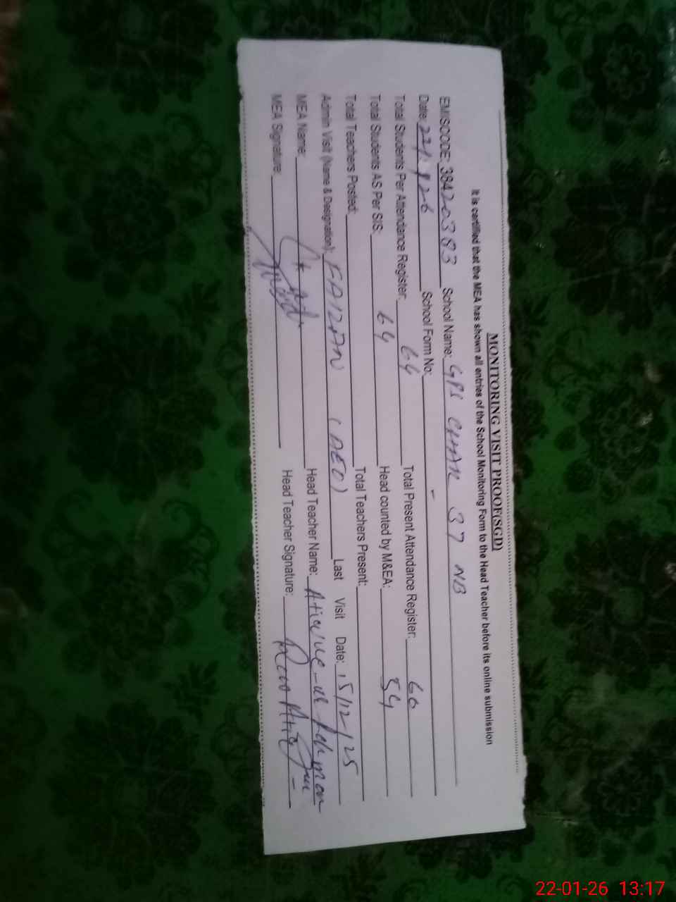 | Attendance Register | Head Teacher | MEA with School | Visit Proof |