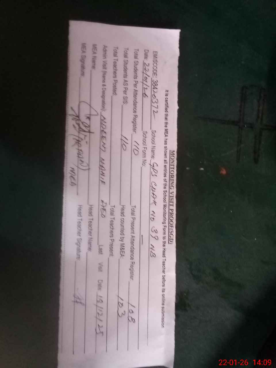 | Attendance Register | Head Teacher | MEA with School | Visit Proof |