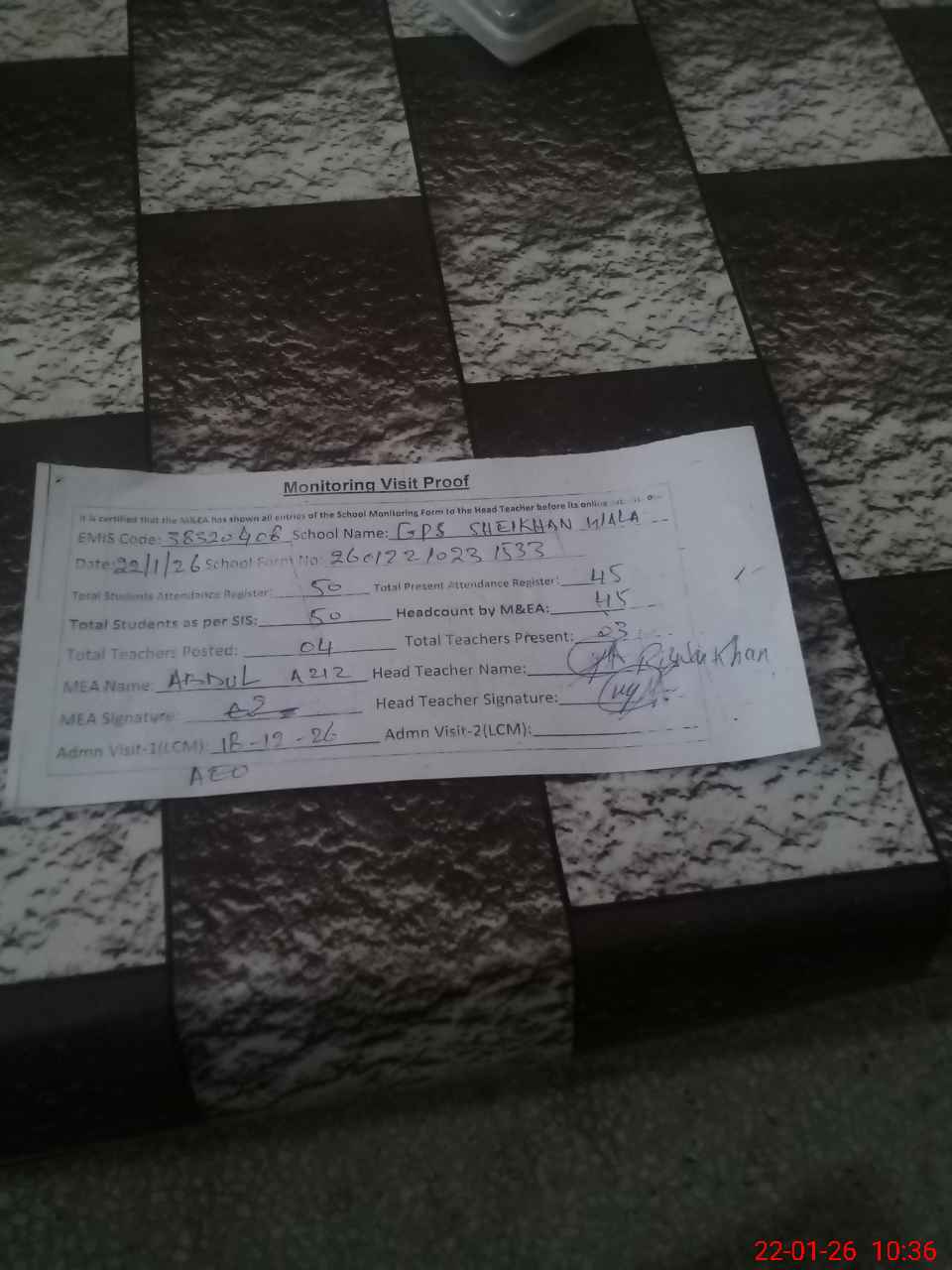 | Attendance Register | Head Teacher | MEA with School | Visit Proof |