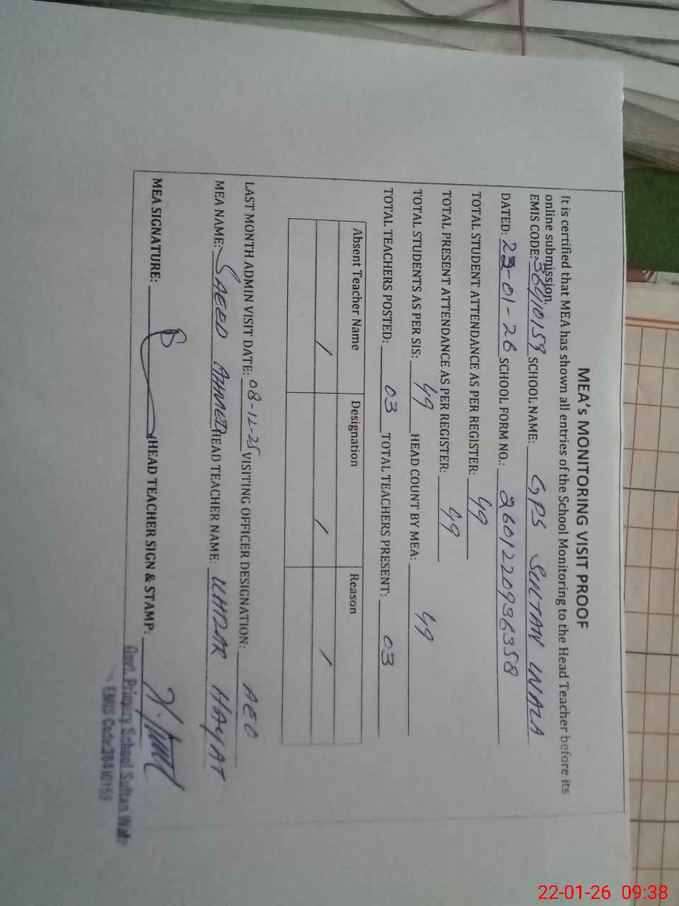 | EMIS Code: 36410159 | Name of School: GPS SULTAN WALA, P/O HAQ NAWAZ WALA, KABIRWALA | |||